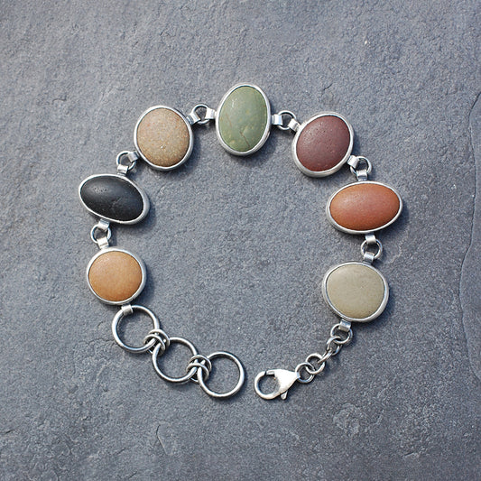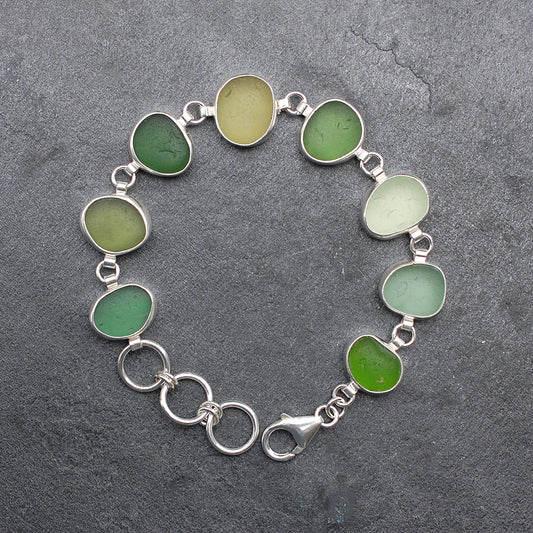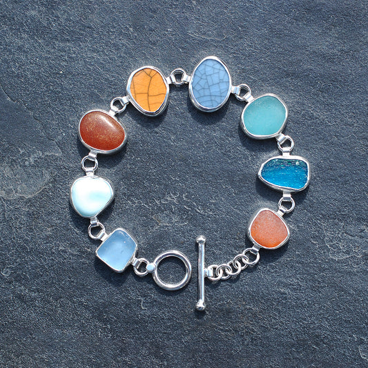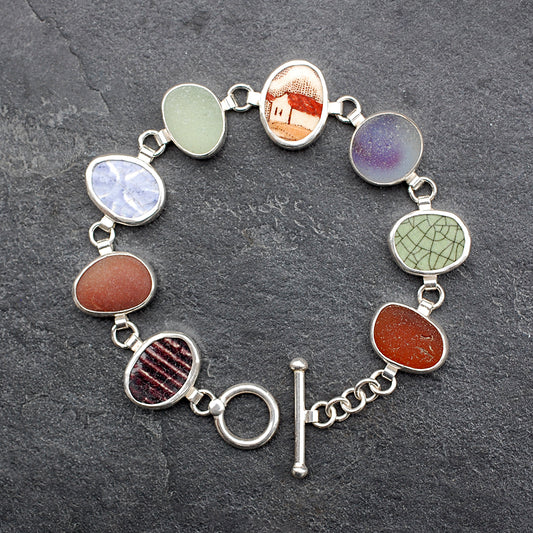 Green, Purple and Brown Sea Glass and Pottery Bracelet Sterling Silver