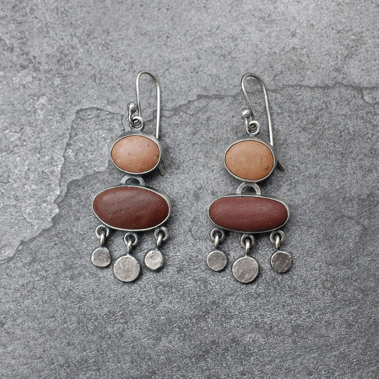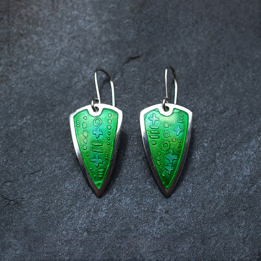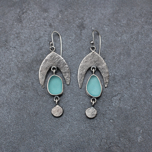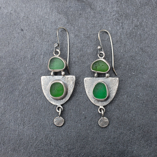 Hammered Sterling Silver Shield Earrings with Green Sea Glass